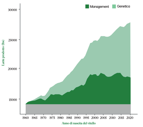 Secondo studi statunitensi, la produzione di latte di un allevamento è influenzata per il 70% dal management aziendale e per il 30% dalla genetica utilizzata. Nel grafico sottostante, l’area gialla mostra l’incremento produttivo dovuto al miglioramento della gestione, mentre l’area blu indica l’incremento legato alla genetica. La genetica e la gestione ‘funzionano’ in parallelo e un fattore non esclude l’altro. Questi miglioramenti paralleli consentono la massima espressione del potenziale genetico.