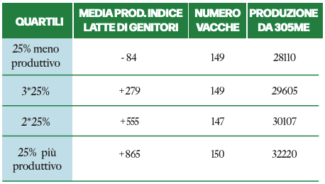 Molti fattori influenzano questo aspetto ma la genetica gioca un ruolo fondamentale per raggiungere produzioni elevate. Recentemente è stato analizzato un allevamento con duemila vacche da latte nel sud del Wisconsin, per capire quanto incida il valore di una genetica eccellente. Sono stati presi in considerazione tutti i capi in prima lattazione all’interno della mandria per determinare la media di produzione di latte dei genitori. In seguito questa media è stata comparata alle attuali performance delle vacche in stalla. La seguente tabella analizza la produzione di latte e mostra i report provenienti da DairyComp 305, comparando le performance di questi animali con le medie dei loro genitori.
