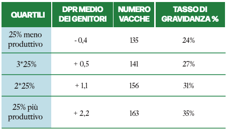 La differenza del DPR tra il miglior 25% e il peggior 25% degli animali in prima lattazione è di 2,6 punti. Poiché ogni punto di DPR permette di avere quattro giorni vuoti in meno, il miglior 25% a DPR dovrebbe concepire più di 10 giorni prima rispetto al peggiore 25%. I dati ricavati da DairyComp 305 mostrano come l’allevamento in questione abbia 11 punti di differenza nel PR tra il miglior 25% e il peggior 25%. Questo dato è l’equivalente di 44 giorni vuoti in meno, e cioè più di due cicli vuoti!