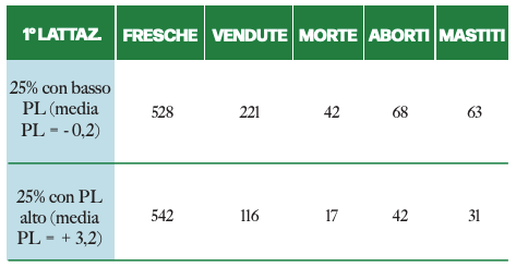 Ogni allevatore esige vacche in salute, che producano molto, fecondate in modo efficiente e che richiedano il minimo intervento di gestione. I costi associati ai capi bisognosi di trattamenti che vanno oltre i trattamenti sanitari, includono più costi di lavoro e produzioni ridotte per ogni lattazione. se l’obiettivo è ottenere vacche sane, la risposta è chiara da molto tempo. Per aumentare la salute e la longevità della mandria, è opportuno selezionare in base alla Longevità (Productive Life, PL) e includere questo tratto nel programma di selezione. La tabella dell’analisi della PL prende in considerazione lo stesso allevamento e divide la mandria in base alla media della PL genitoriale. Si nota che il 25 % con PL alta ha meno aborti, mastiti, morti o animali venduti.