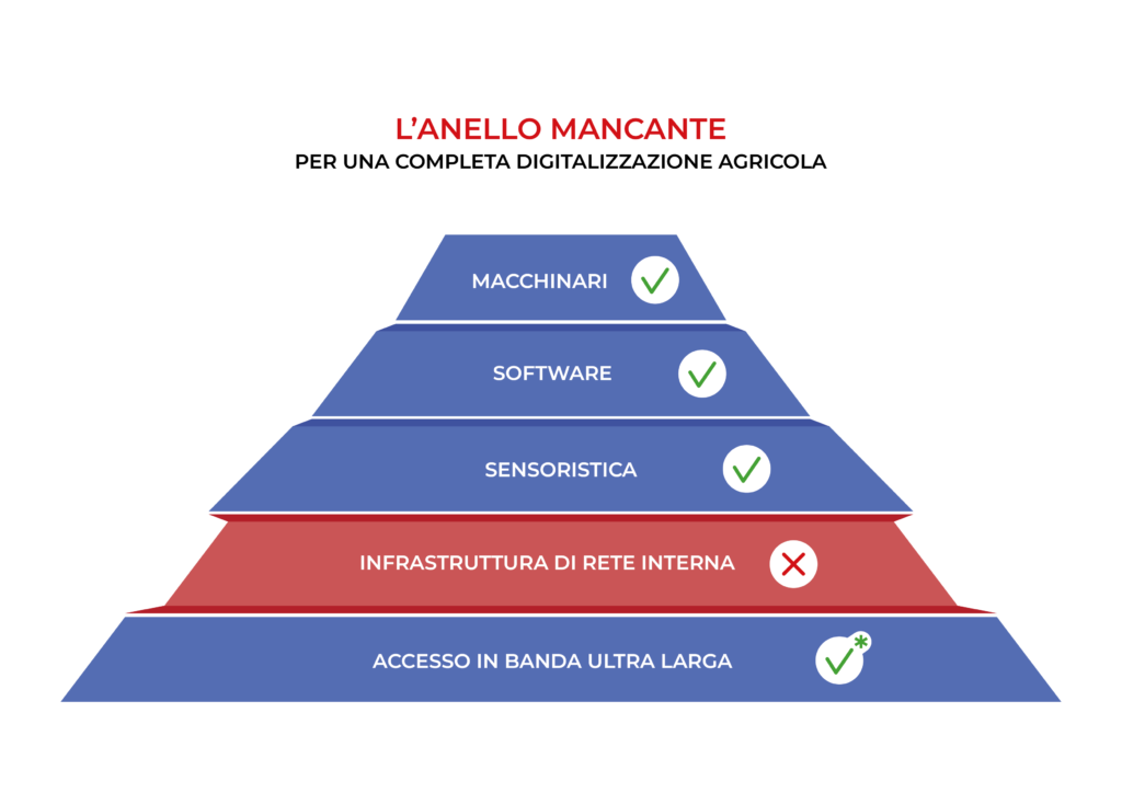 Benché quindi già esistano misure di supporto per l’acquisto di macchinari intelligenti, sensoristica e software, la loro efficacia è frustrata dall’assenza di analoghe misure che consentano di ridurre il costo iniziale, a monte, di infrastrutturazione e sviluppo rete delle aziende agricole. Un costo che rappresenta il primo, e spesso insormontabile, ostacolo verso i successivi passaggi (investimenti in IoT, cloud, ecc).