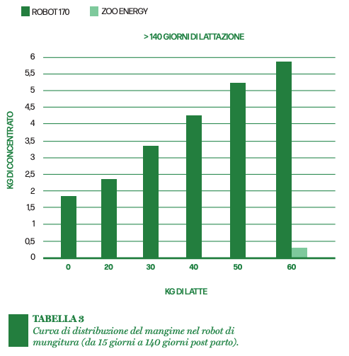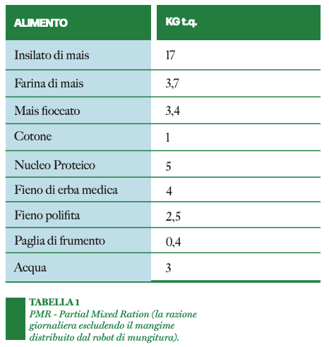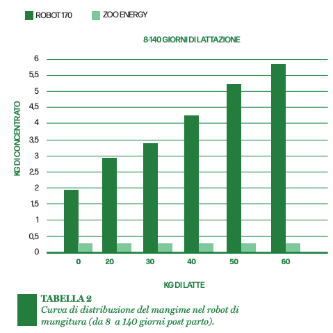 Per il mangime da robot invece la scelta è ricaduta su un prodotto d’eccellenza un mangime caratterizzato da un’elevata quota amidacea, associata a un interessante livello di fibra (polpe di bietola e bucce di soia) ed all’inclusione di carruba come principale appetizzante. Infine, nel robot per gli animali più performanti è utilizzato su una seconda linea di alimentazione un mangime liquido energetico costituito principalmente da una miscela di zuccheri semplici.
