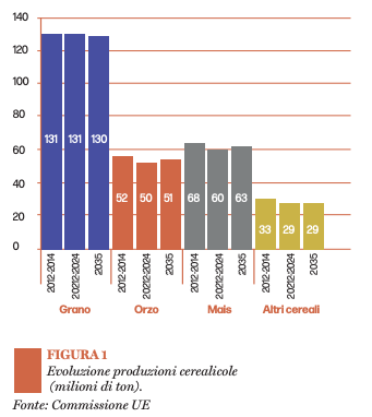 Riguardo i seminativi, si prevede che la diffusione di tecniche innovative sia sul piano agronomico che genetico porterà a un generale aumento delle rese a ettaro per le principali colture, in grado di compensare gli effetti di una contrazione stimata delle superfici coltivate, con una conseguente crescita complessiva della produzione comunitaria di cereali (+1,1% al 2025). In particolare, si prevede una ripresa delle produzioni comunitarie di mais, dopo i cali degli ultimi anni, per un raccolto complessivo di oltre 63 milioni di tonnellate, così come di grano duro e orzo, in controtendenza rispetto al grano tenero.