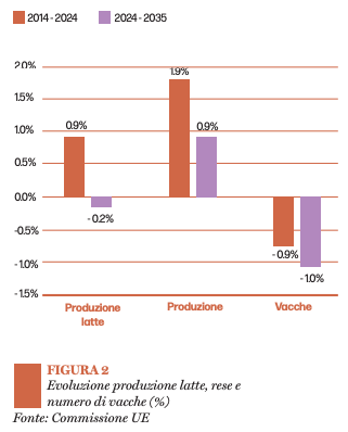 In generale, le stime della Commissione indicano un rallentamento della crescita della produzione agricola comunitaria nel prossimo decennio, seppur con andamenti divergenti tra i diversi settori. Le preferenze dei consumatori, sempre più attenti a richiedere prodotti percepiti come meno impattanti in termini ambientali e più salutari, contribuiranno alla transizione verso sistemi produttivi ancora più sostenibili dal punto di vista ambientale e del benessere animale, ma allo stesso tempo in grado di soddisfare la domanda. Le stime, infatti, indicano la tenuta dei consumi di prodotti lattiero-caseari (+ 2 kg pro-capite entro il 2035), anche se con importanti variazioni interne alla categoria, intese a privilegiare formaggi e prodotti a basso contenuto di grassi e privi di lattosio, mentre proseguirà il trend in calo della spesa di latte alimentare.